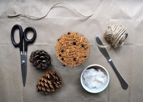 Dennenappels gevuld met voer voor tuinvogels